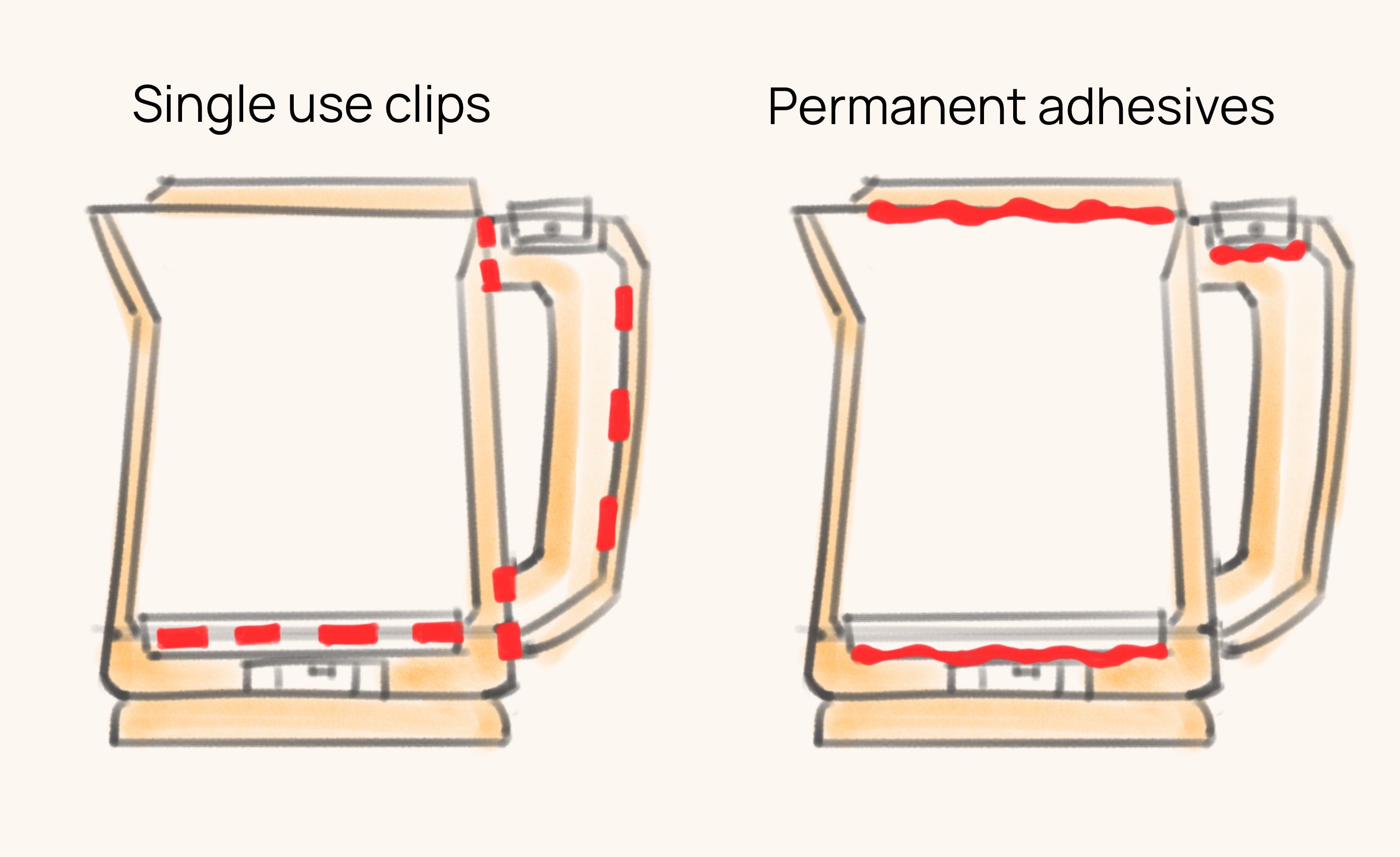 but the placement of single use clips and permanent adhesive make the disassembly of the product destructive or impossible.