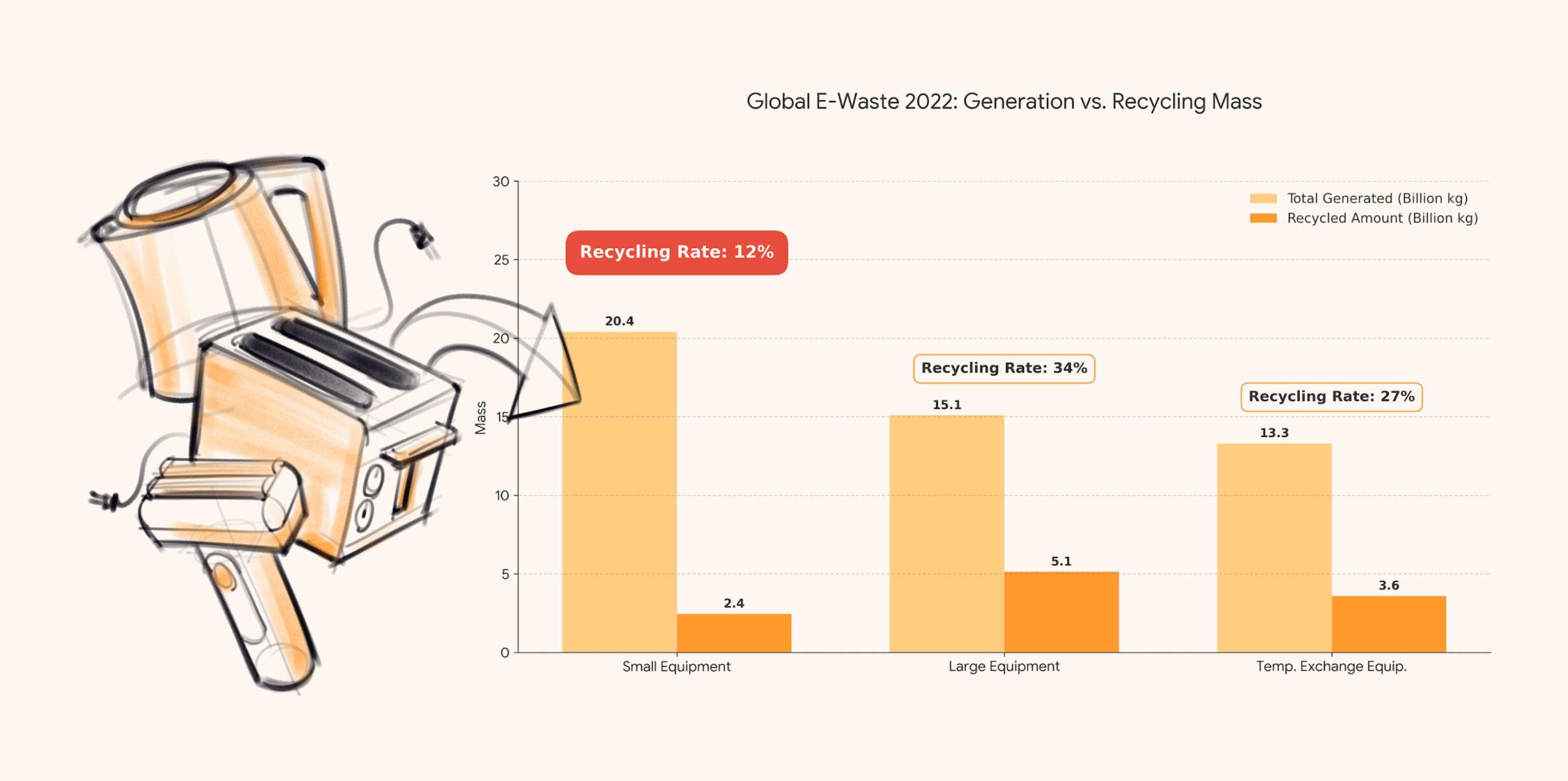 Small appliances are the largest e-waste category (33% of total) yet have the second-lowest recycling rate at only 12%.