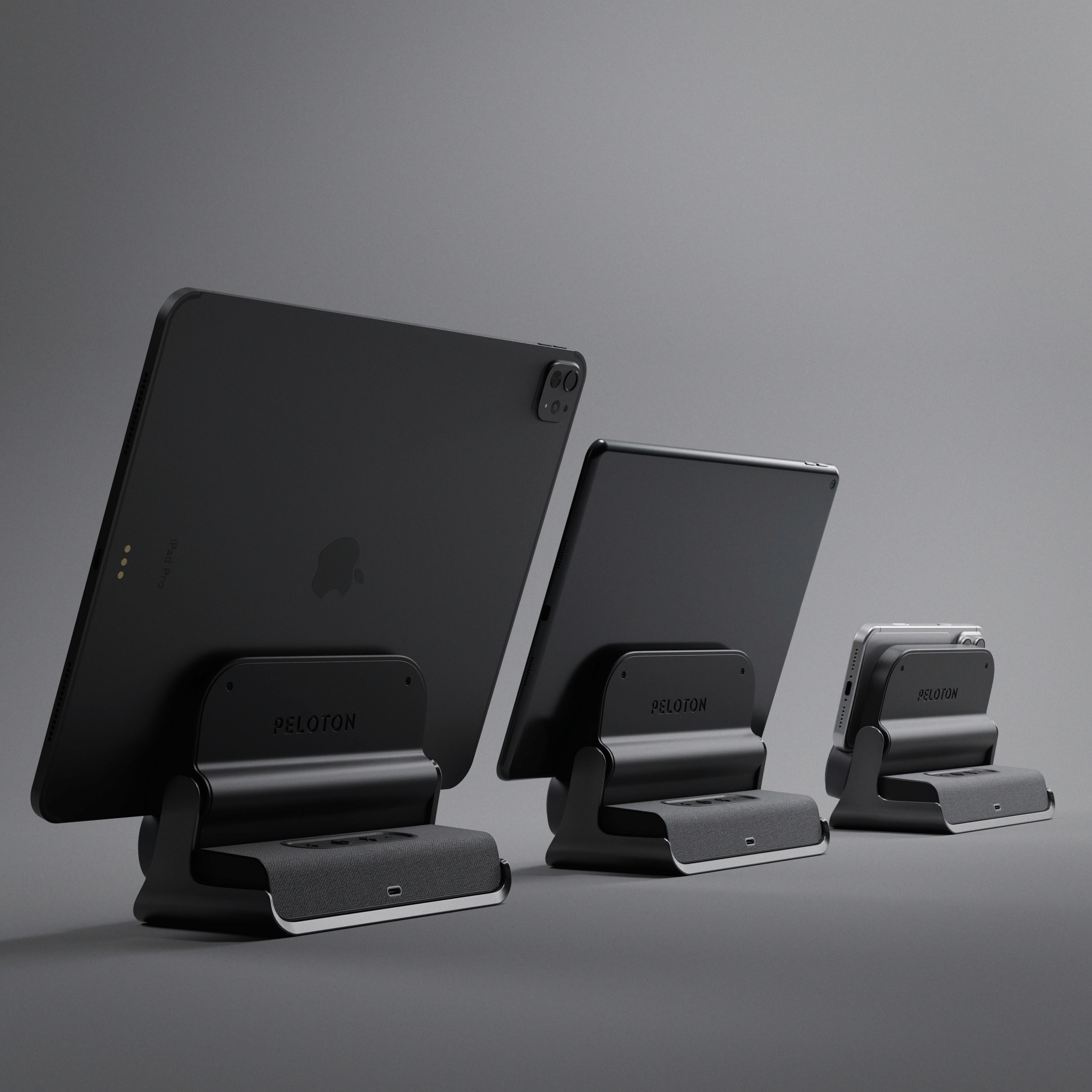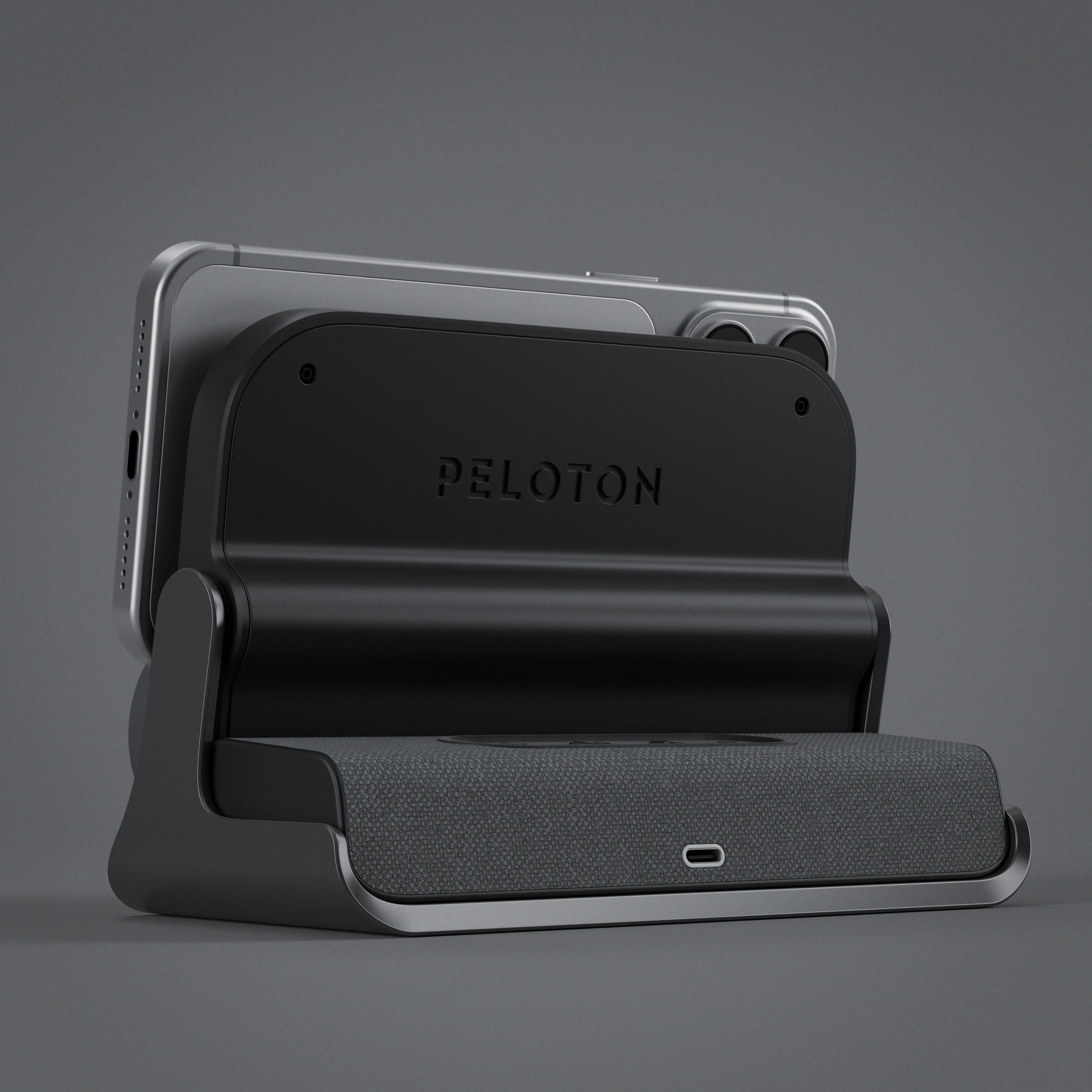 A Peloton device stand, Bluetooth speaker, and app integration packaged as one object.