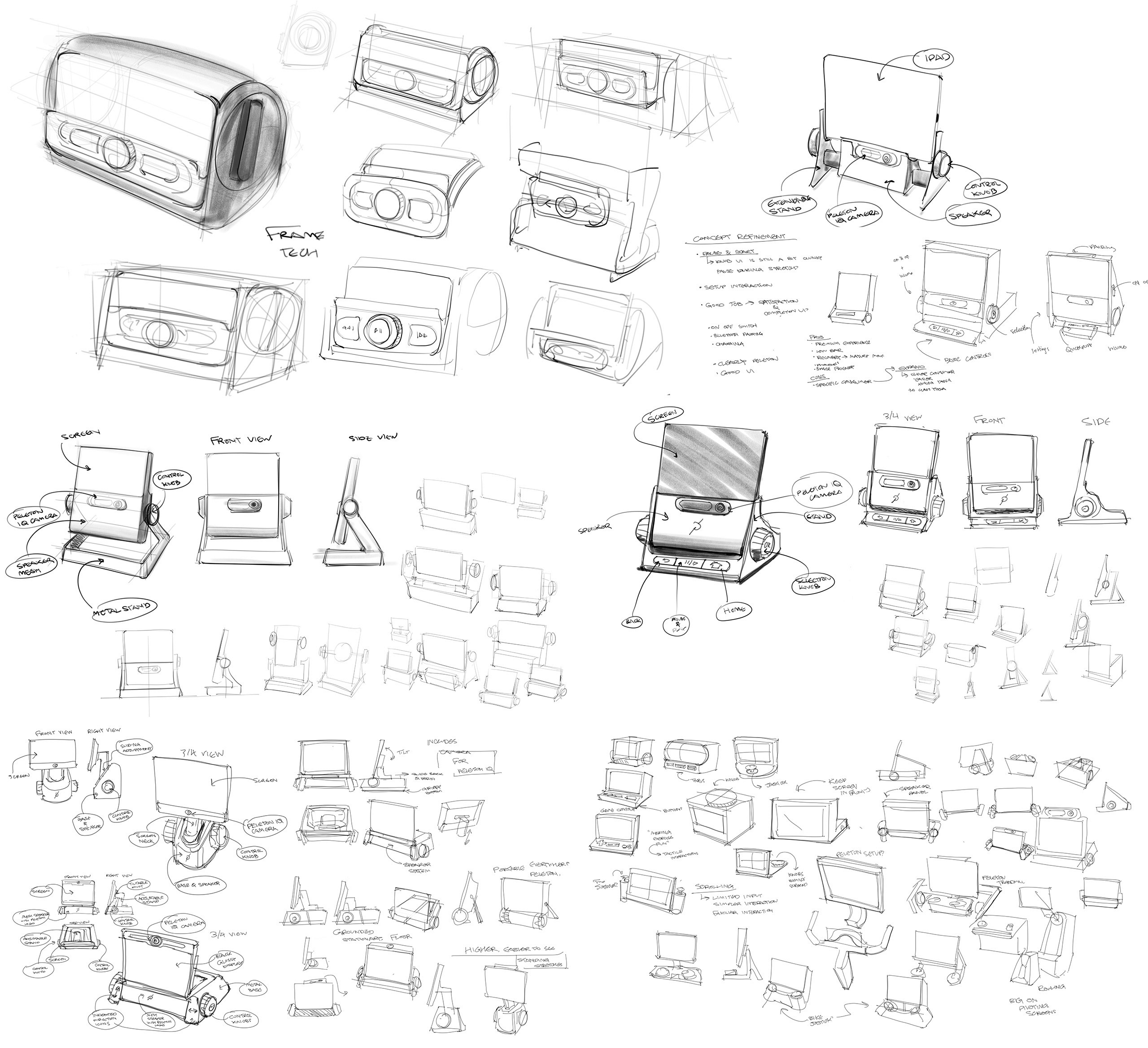 Early ideation explored stand geometry, control layout, and speaker integration across several distinct form directions.